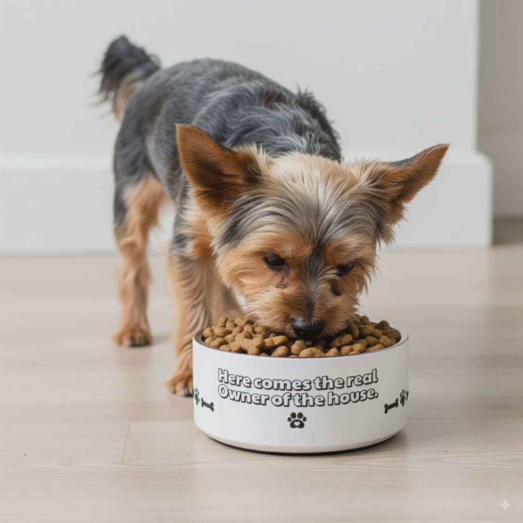 Pet bowl + WITH THE PHRASE "THE TRUE OWNER OF THE HOUSE EATS HERE"